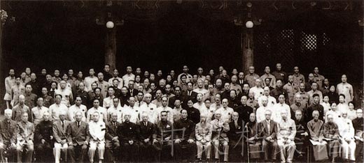 一届全国人大一次会议期间,国家领导人与代表们合影。前排右起:黄炎培、陈云、林伯渠、张澜、宋庆龄、朱德、毛泽东、刘少奇、李济深、周恩来、董必武、郭沫若。
